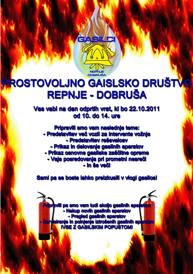 PGD Repnje Dobruša vas vabi na dan odprtih vrat, ki bo 22.10.2011 od 10. do 14. ure. V soboto si boste lahko ogledali različne dajvnosti, ki vam jih bodo predstavili domači gasilci ter tudi gostje. Več si lahko preberete na spodnjem letaku (za povečavo klikni na sliko).